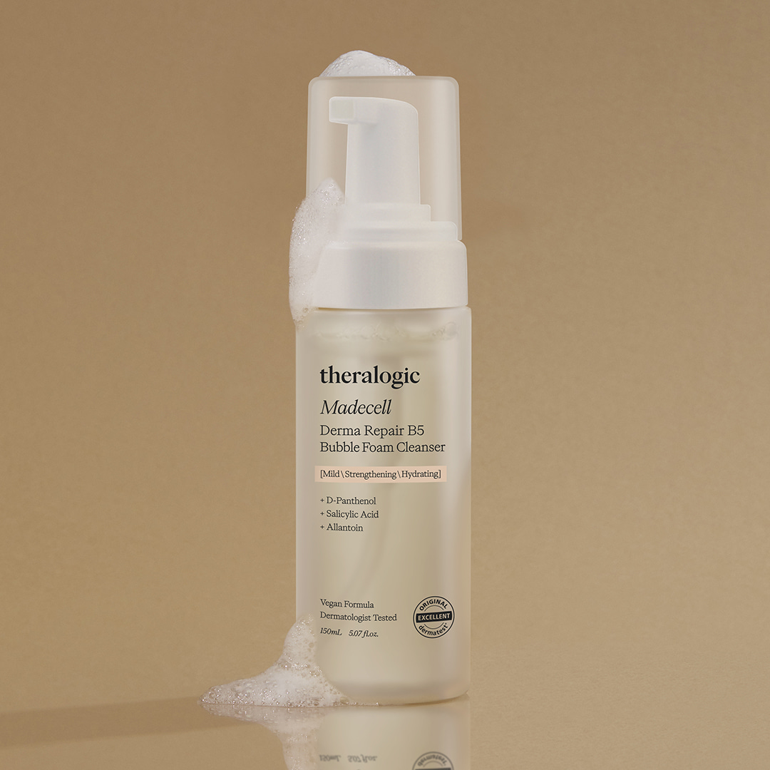 Theralogic Madecell Derma Repair B5 Bubble Foam Cleanser is a dermatology-grade, low-pH (5.5–6.5) cleanser developed to purify the skin without disrupting its natural barrier.